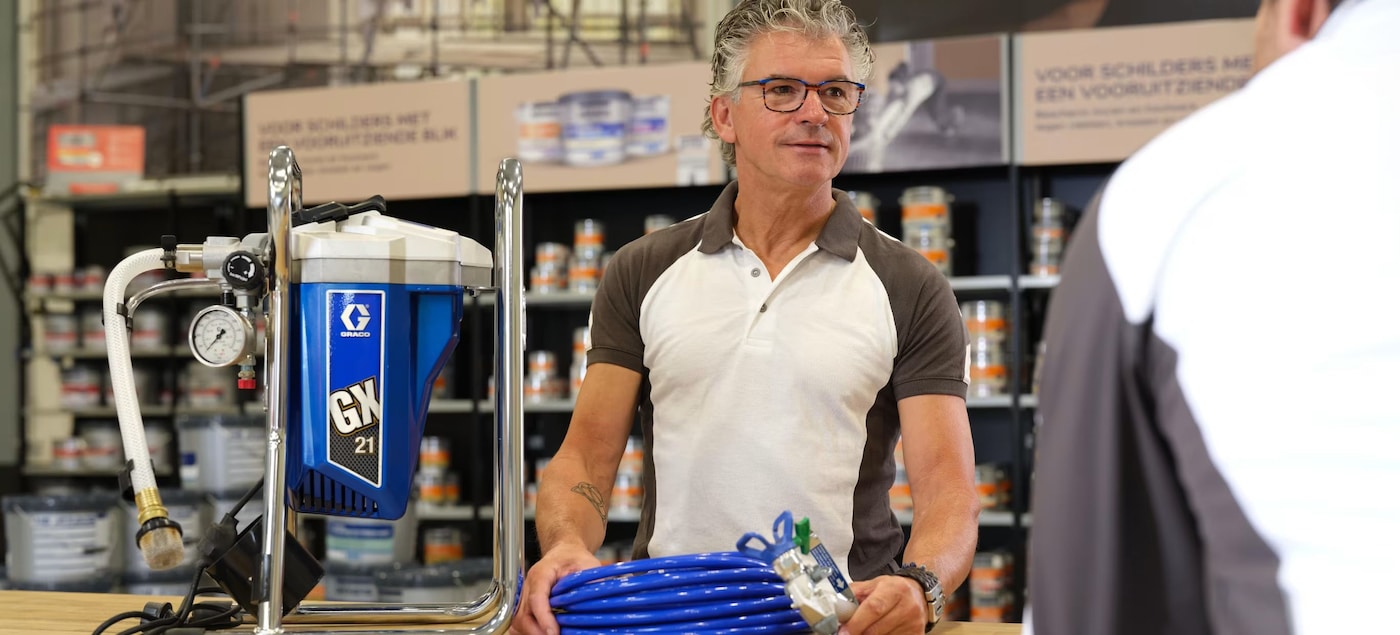 Als applicatiespecialist bij AkzoNobel ziet Marinus Mensink dagelijks hoe het schildersvak verandert. Waar vroeger de roller en kwast de norm waren, wint het verspuiten van muurverf snel terrein. En dat is niet voor niets. “De snelheid is het grootste voordeel” vertelt Marinus. “Je hebt vaak aan één laag genoeg, en het resultaat is veel strakker. Geen roleffect, geen banen, de verf vloeit super egaal uit.”