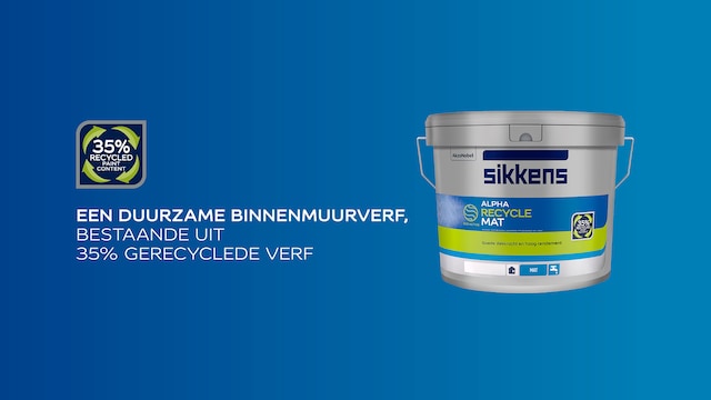 Het groot gedeelte van het verfafval in Nederland belandt in de verbrandingsoven. Daar willen wij bij Sikkens wat aan doen. In samenwerking met InterCheM, een internationaal inzamelings-, verwerking-, en recyclingbedrijf, is Sikkens Alpha Recycle Mat ontwikkeld. Een binnenmuurverf welke gemaakt wordt van 35% gerecyclede verf.